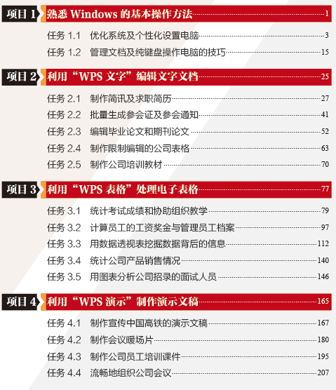 WPS Office 是一款优秀的办公软件套装,可以实现文字、表格、演示等多种办公功能。《 WPS Office 高级应用综合案例教程》正是以 WPS 办公软件为蓝本,以具体的项目需求为引导,系统全面地讲解 WPS 在编辑文稿、处理表格、制作演示文稿等方面的实践应用与操作技巧。同时采用项目式教学,每个项目都设置了“项目导读”“学习目标”“项目小测”和若干个任务,每个任务都模拟一个实际案例,帮助学生掌握和应用常见的相关技能。