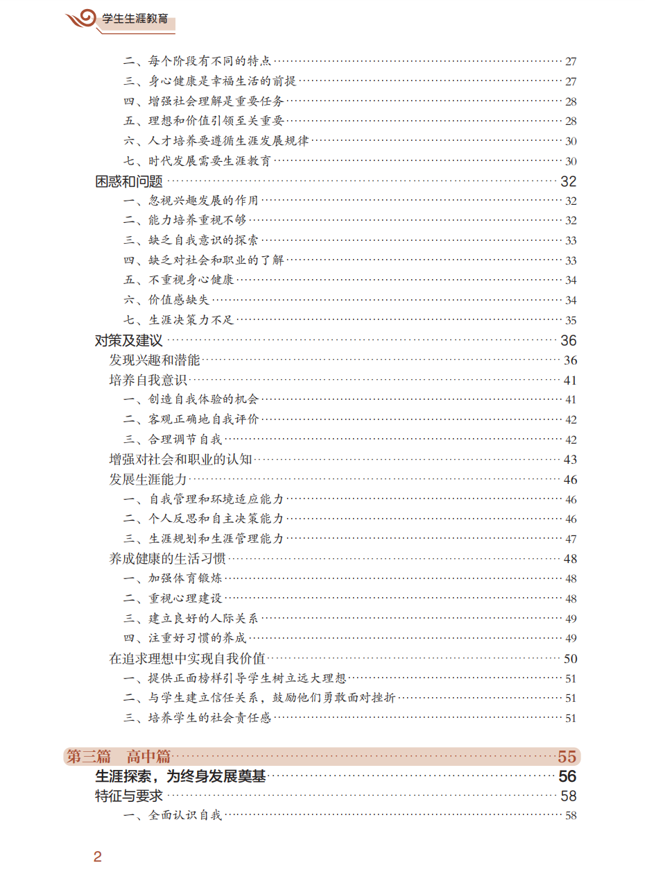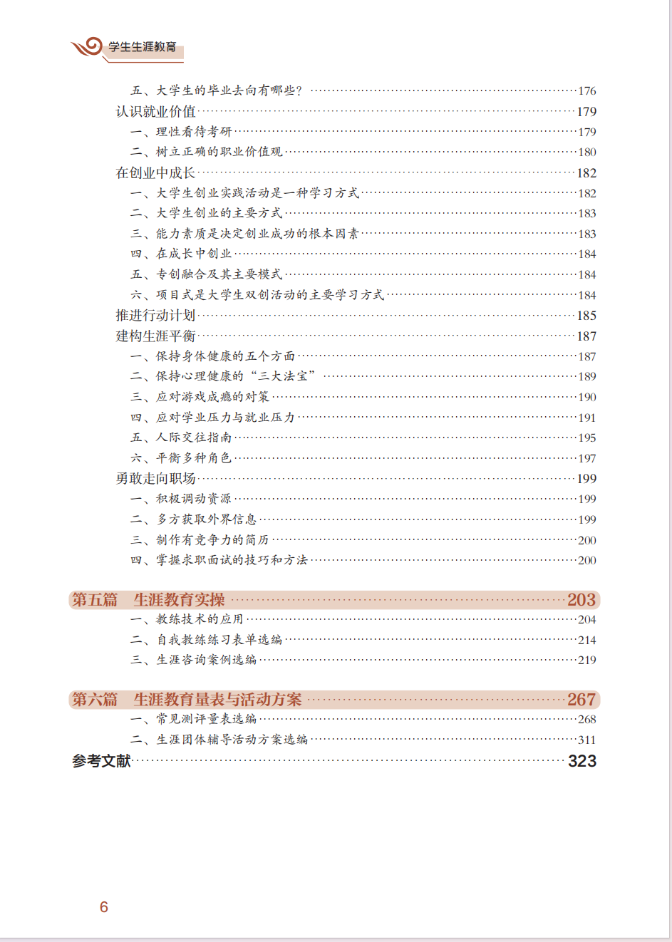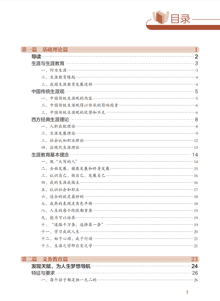 全书分为六个部分:第一部分是生涯教育基本知识和基本理念;第二、三、四部分分别是义务教育、高中和大学阶段生涯教育的基本特征、核心任务和实施对策;第五部分和第六部分是一些常用工具和精选案例。