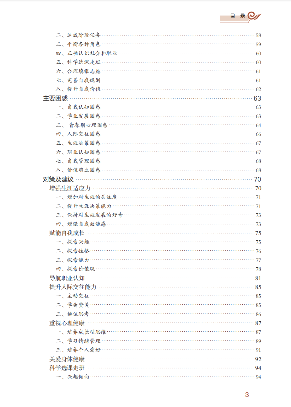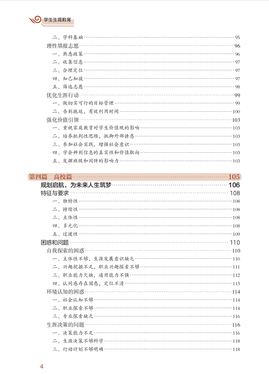 无论是小学、中学,还是大学,学生都会遇到各种各样的难题,需要做出正确的选择,需要用正确的思维和科学的方法应对方方面面接踵而至的困惑和烦恼,从而快乐地学习,开心地工作,幸福地生活,顺利地成长。学生生涯教育就是教会学生正确处理生活、学习中的各种问题,更好地认识自我、适应社会、提高综合职业能力和素质,促进学生健康发展、全面发展、终身发展。
