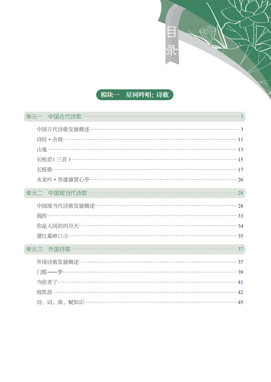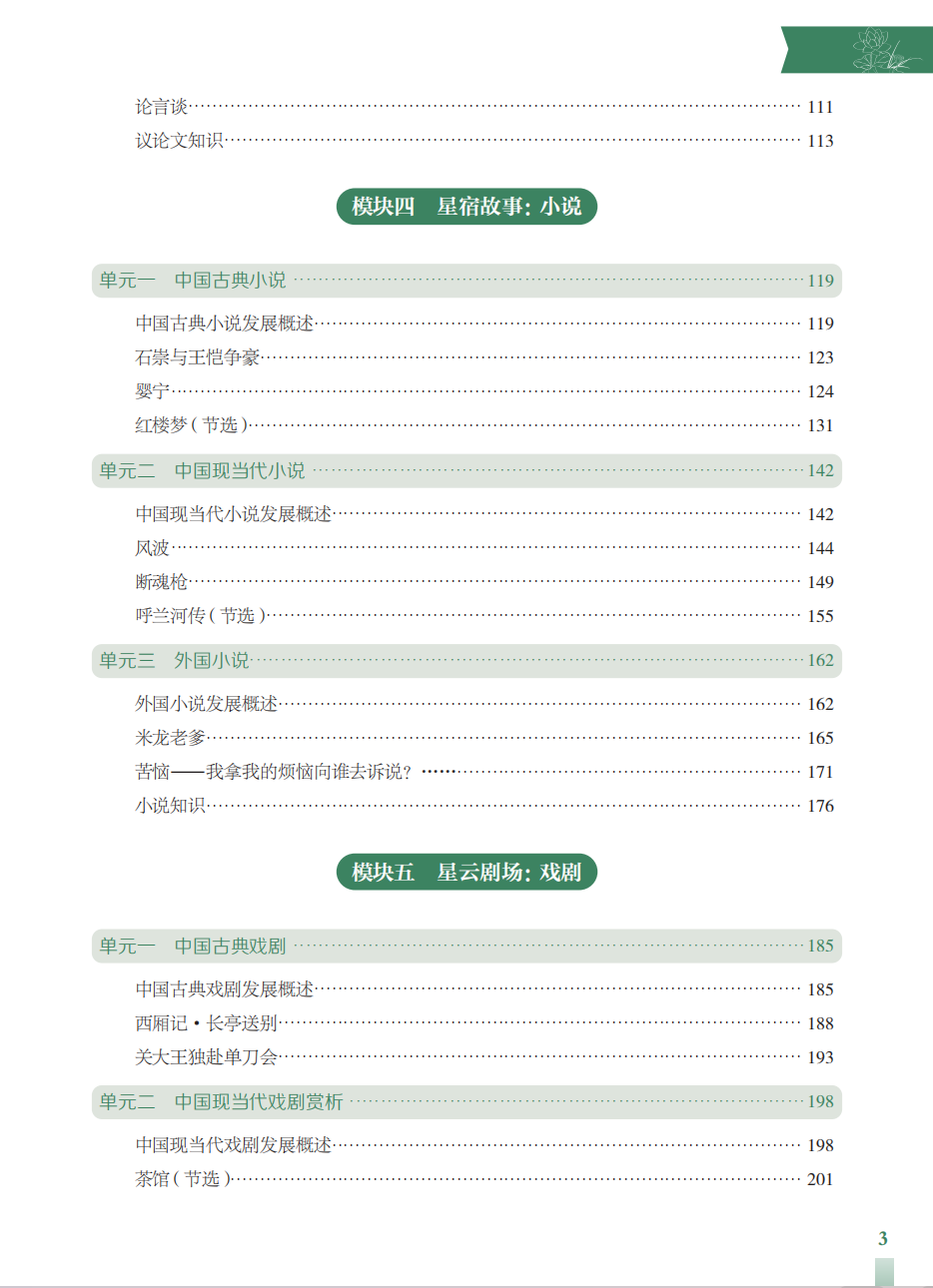 本书基于人文性、实用性、工具性、审美性和趣味性五大原则,精心构建教材体系, 审慎遴选经典篇章。全书共设 5 个模块、14 个教学单元,精选 40 篇文章,涵盖中国古代、 现当代以及外国文学领域,搭建起丰富多元、层次分明的文学学习框架。以文体和文学史 为脉络,将诗歌、散文、议论文、小说、戏剧等不同文体有序铺陈。在选文过程中,我们 既选取了历经岁月沉淀、具有深远影响力的传世名篇,同时也纳入了富有时代气息、展现 当下社会风貌与精神追求的优秀新作,使学生既能领略古人的智慧与情怀,又能感受当代 文学的创新与活力,实现传统与现代的有机结合,帮助学生构建起完整的文学知识体系。 在体例设计上,每一篇章从“星光灿烂”部分入手,让学生在阅读正文之前,对作者的生平经历、创作风格与时代背景有初步了解,为深入理解作品奠定基础;“追光指迷”部分帮助学生扫清文字障碍,理解作品中的疑难字词与典故;“追光密码”部分深度剖析作品的人文内核、艺术特色与思想价值,引导学生从多个角度解读作品,提升文学鉴赏能力;“拾光任务”部分考查语文基础知识、开放性思考等,旨在启发学生感悟生活、思考社会,将 所学知识运用到实际表达中,真正将“求真、求美、求善” 的人文意识贯穿学习的全过程。