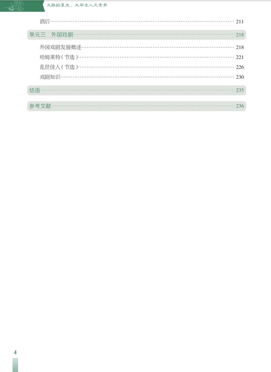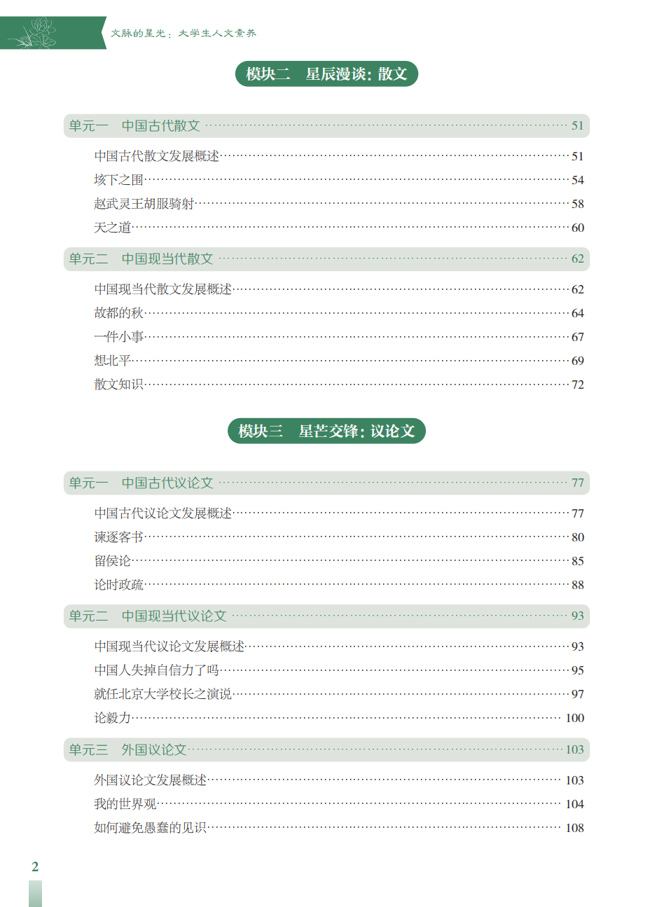 本书的编写始终秉持着明确且坚定的宗旨。首先,致力于突出当代大学生的群体特点, 从内容选材到体例编排,都充分考虑到青年学生的知识储备、兴趣偏好与思维方式,让教 材更贴近学生的学习实际,激发学生的学习热情,真正彰显人文素养课程独特的魅力与价 值。其次,严格遵循语文教育教学的基本规律,将提升学生的人文素养水平作为核心任务 之一。通过精选经典且具有代表性的文学作品,让学生在阅读、分析与写作的实践中,不 断积累语言素材,掌握扎实的人文基础知识与技能,提升语言理解与表达能力。与此同时, 更加注重厚植学生的人文素养,将人文精神的培育贯穿教学始终。每一篇选文都蕴含着丰 富的思想内涵与文化价值,从家国情怀到人生哲理,从道德修养到审美情趣,引导学生在 文学的滋养中,塑造健全的人格,树立正确的世界观、人生观与价值观,实现文与道的完 美融合。