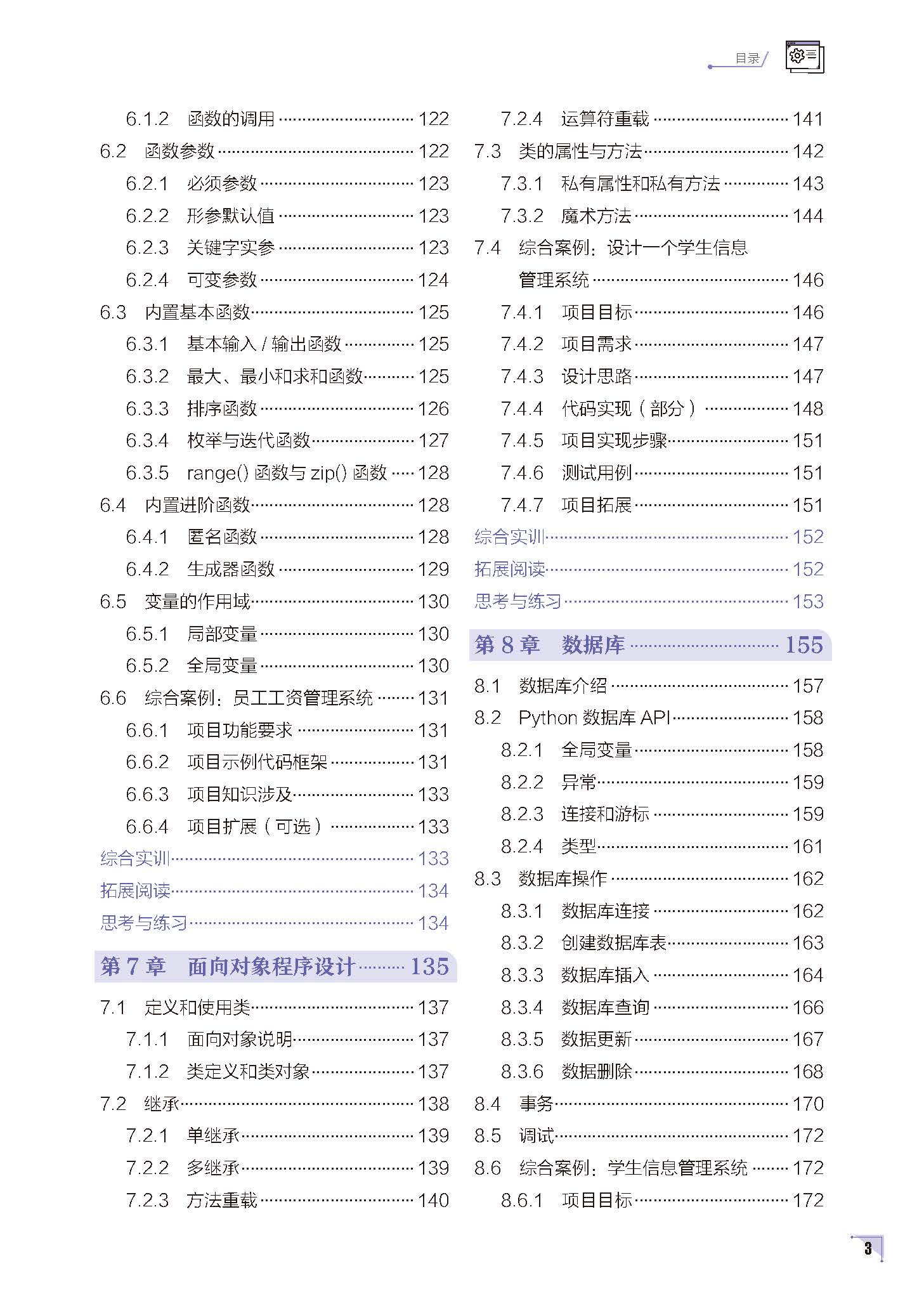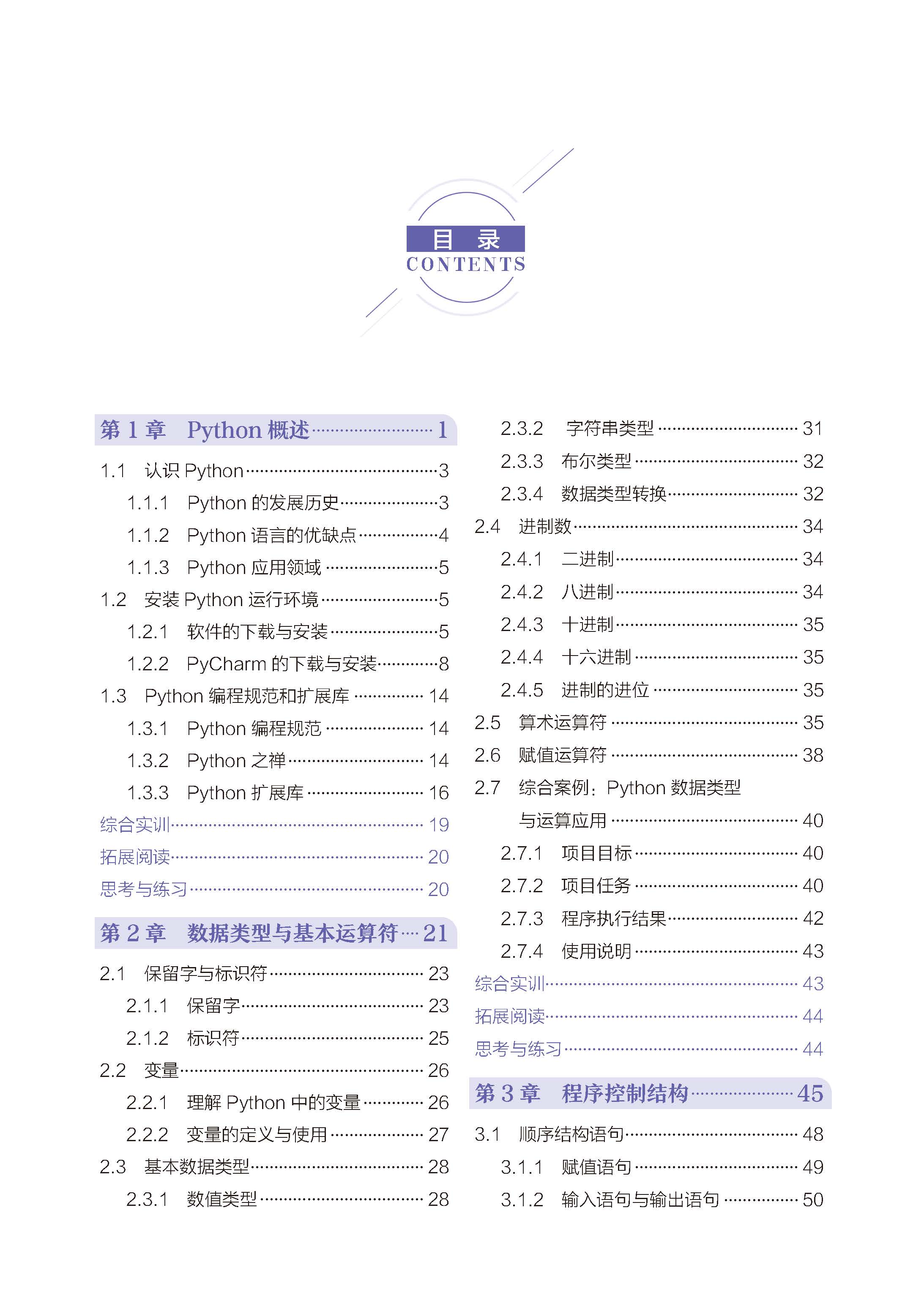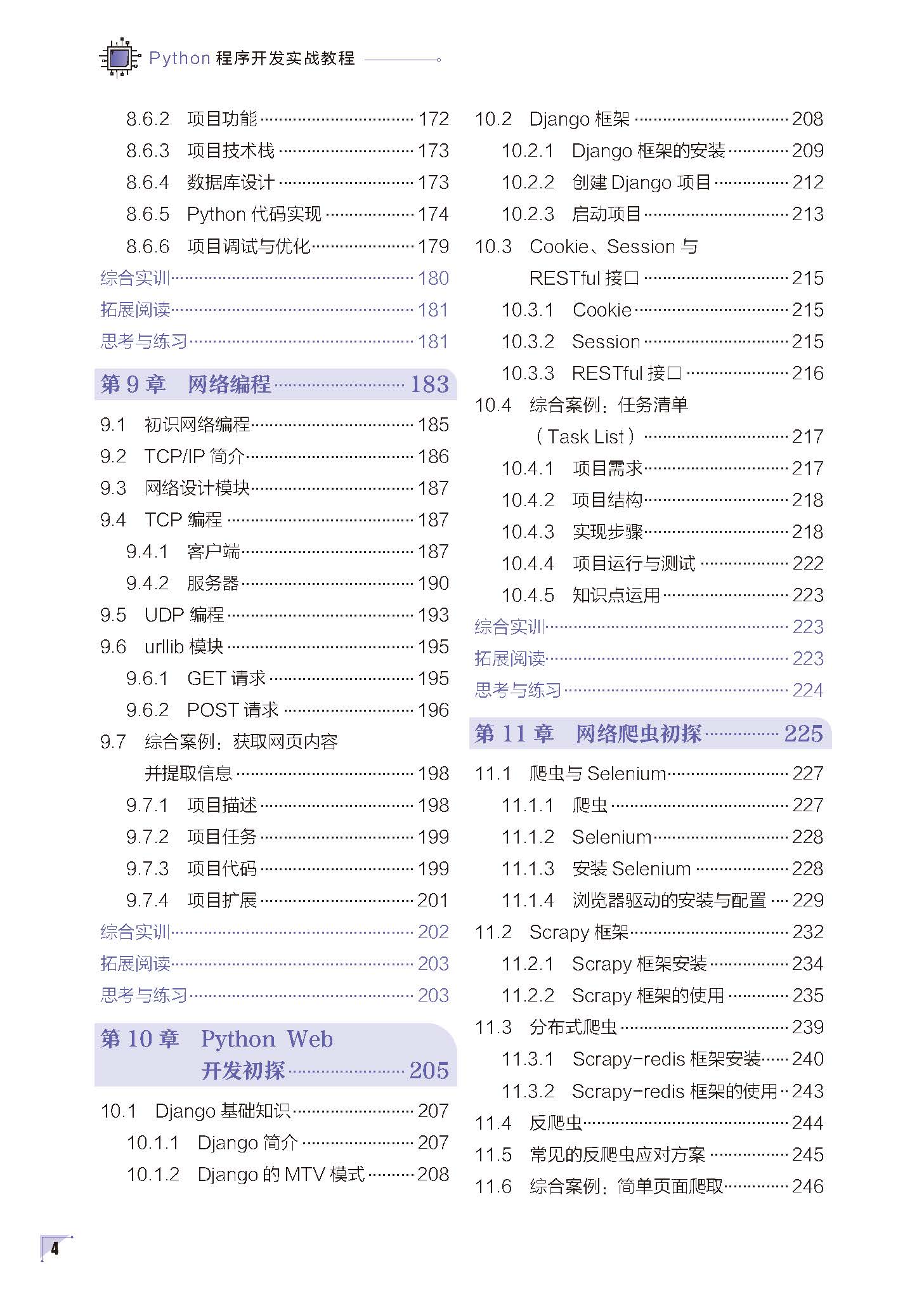 本教材从基础到高级全面覆盖Python 编程内容。第1 章介绍Python,包括其发展历史、语言的优缺点、应用领域、运行环境、编程规范和扩展库。第2 章讲解数据类型与基本运算符,包括保留字与标识符、变量、基本数据类型、进制数、算术运算符和赋值运算符。第3 章探讨程序控制结构,包括顺序结构语句、条件结构语句、语句的嵌套、使用and 连接条件的选择语句、使用or 连接条件的选择语句、使用not 关键字的选择语句、循环结构和异常处理。第4 章聚焦Python 序列,包括列表、元组、集合和字典。第5 章介绍正则表达式,包括正则表达式基础和re 模块。第6 章讲解Python 函数,包括定义和调用函数、函数参数、内置基本函数、内置进阶函数和变量的作用域。第7 章阐述面向对象程序设计,包括定义和使用类、继承、类的属性与方法。第8 章涉及数据库,包括数据库介绍、Python 数据库API、数据库操作、事务和调试。第9 章介绍网络编程,包括初识网络编程、TCP/IP 简介、网络设计模块、TCP 编程、UDP 编程和urllib 模块。第10 章初探PythonWeb,包括Django 基础知识、Django 框架、Cookie、Session 与RESTful 接口。第11章介绍网络爬虫,包括爬虫与Selenium、Scrapy 框架、分布式爬虫、反爬虫和常见的反爬虫应对方案。第12 章初探人工智能,包括机器学习和深度学习。