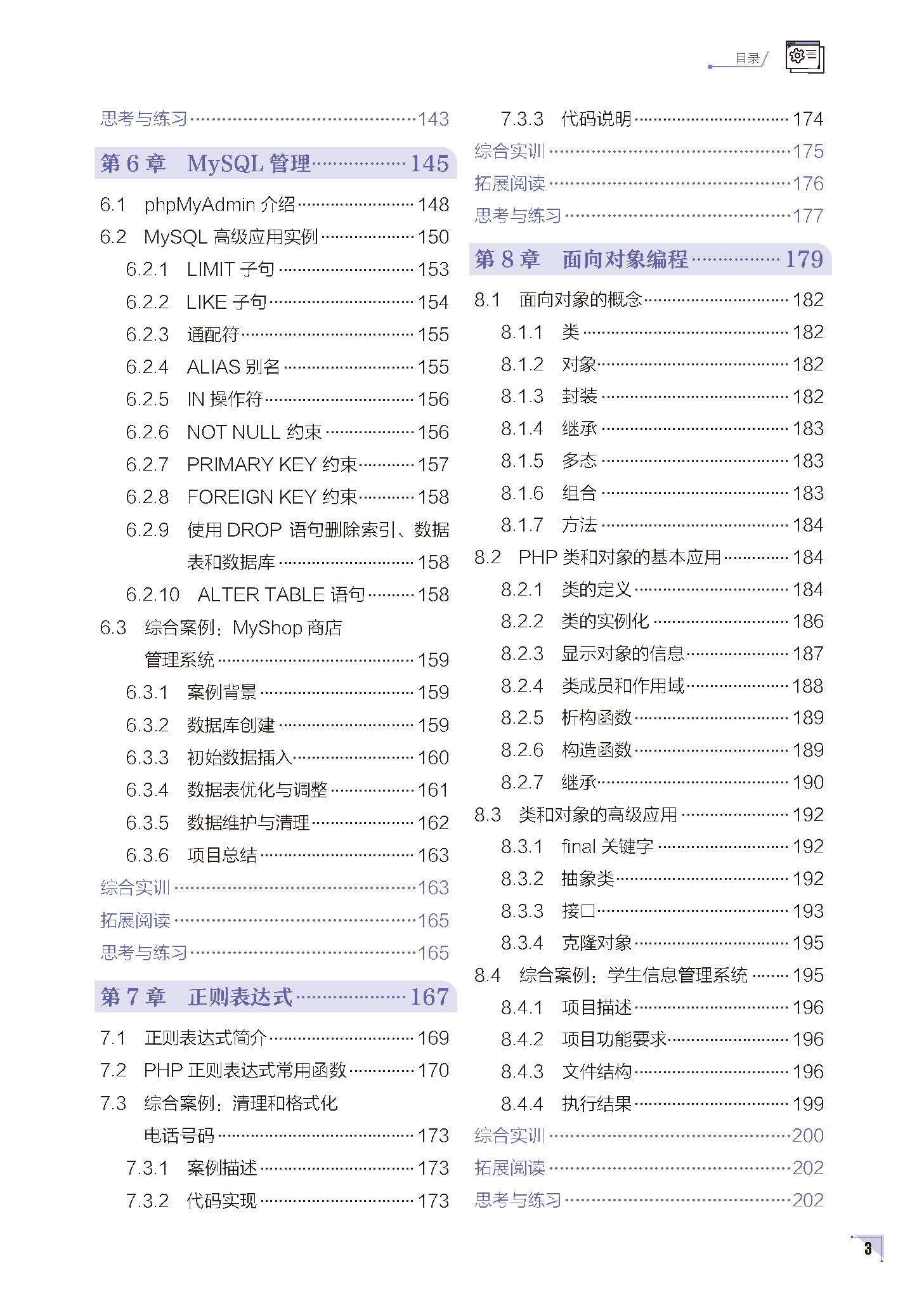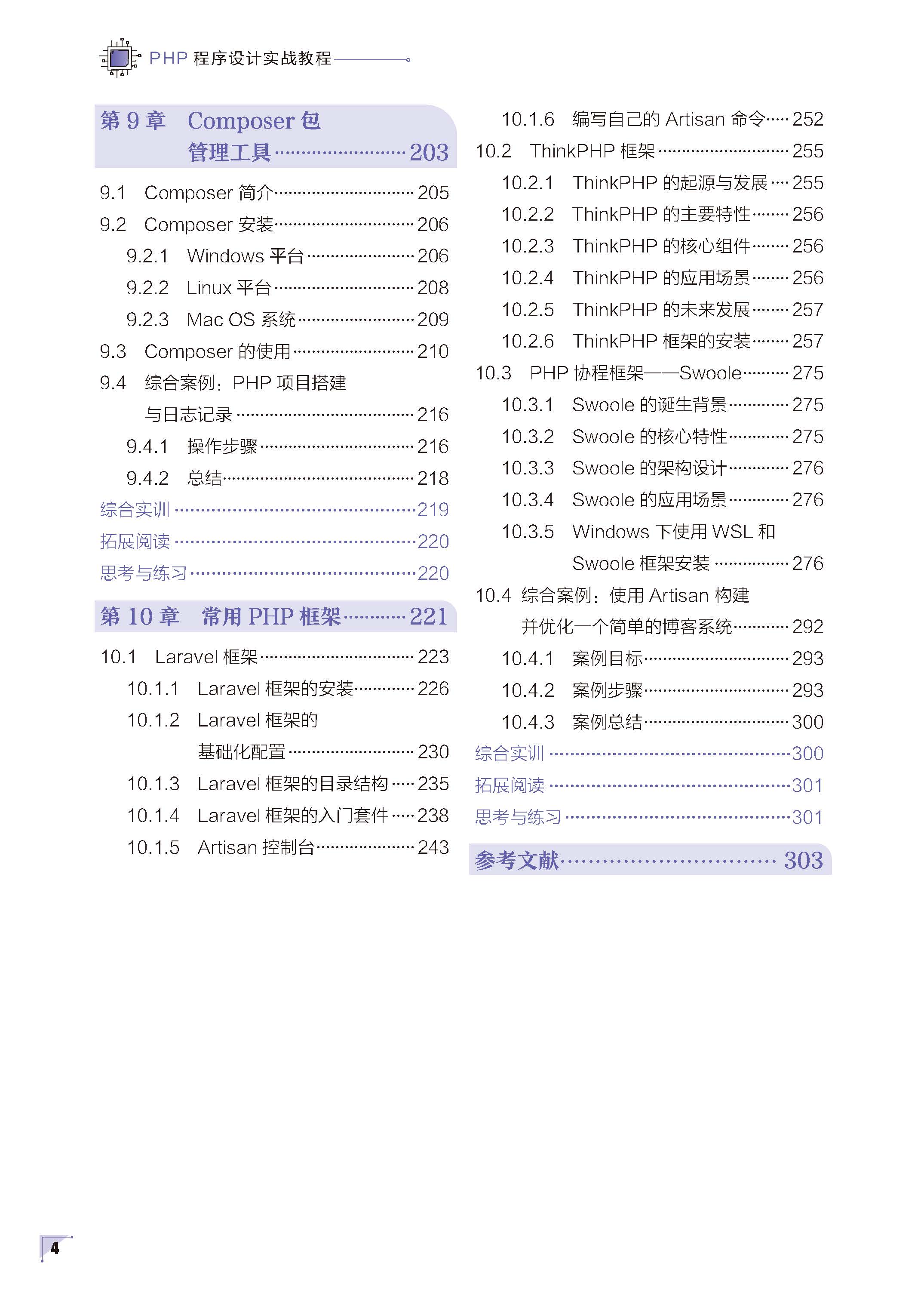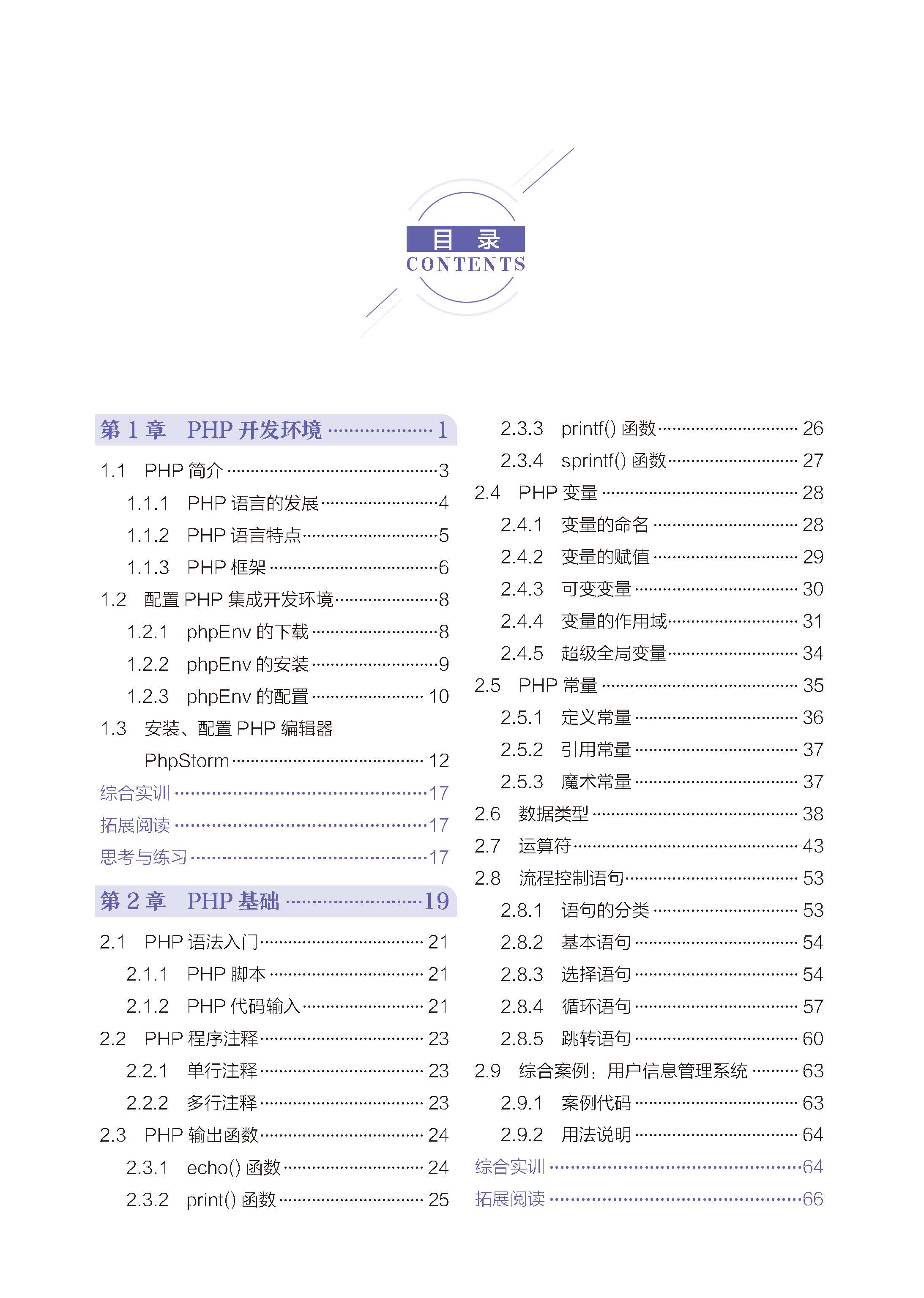 本书旨在为广大学习者和开发者提供一本系统、全面且实用的PHP 学习教程,助力培养适应新时代需求的Web 开发人才,为科技强国建设添砖加瓦。本书内容的编排遵循由浅入深、循序渐进的原则,共分为10 章,涵盖了PHP 开发的各个方面,形成了一个完整的知识体系。第1 章介绍PHP 环境搭建,包括PHP 简介、配置和PhpStorm 设置。第2 章深入讲解PHP 基础语法,涵盖语法入门、注释、输出函数、变量、常量、数据类型、运算符和流程控制语句。第3 章探讨函数与数组,强调函数在代码封装和复用中的重要性,以及数组的使用方法。第4 章聚焦目录和文件操作,讲解各种操作方法,并通过日志管理工具案例,让读者学会将这些知识应用于实际场景。第5 章和第6 章分别介绍PHP 与数据库交互和MySQL 数据库管理。第7 章介绍正则表达式在PHP 中的应用,详细讲解常用函数,并通过电话号码清理和格式化的实际案例,阐释正则表达式的具体运用。第8 章探讨面向对象编程(OOP)在PHP 中的应用,介绍面向对象概念和PHP 中的类和对象的基本和高级应用。第9 章介绍Composer 包管理工具,讲解其简介、安装和使用方法,并通过PHP 项目搭建与日志记录案例,让读者掌握Composer 在PHP 项目中的应用。第10 章聚焦常用的PHP 框架,包括Laravel、ThinkPHP 和Swoole。