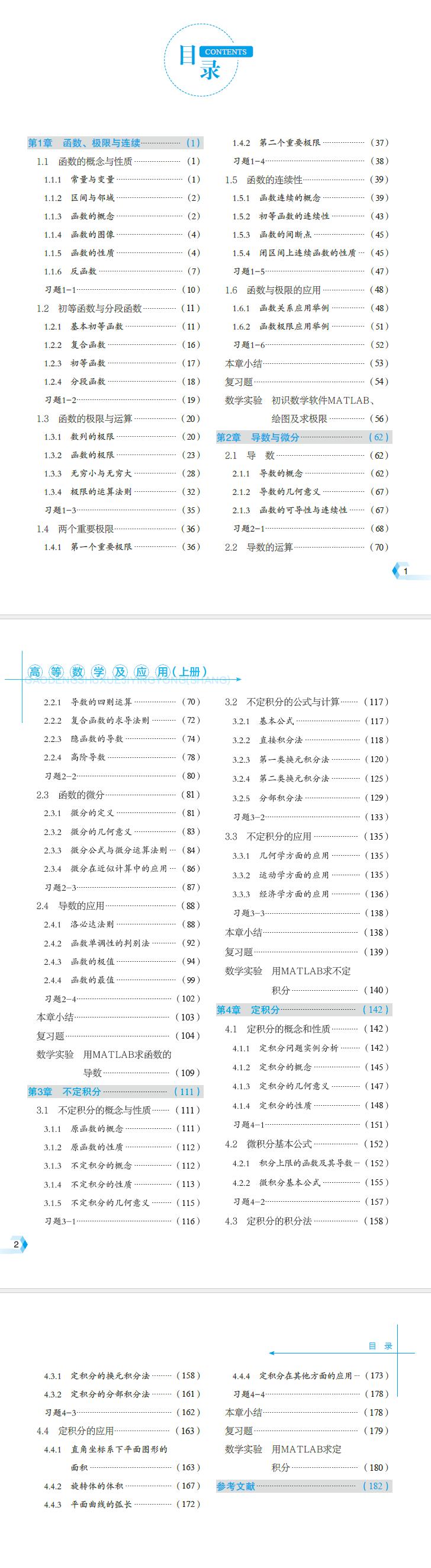 本套教材分为上、下两册共 8 章,本书为上册共 4 章,包括函数、极限与连续、导数与微分、不定积分和定积分 . 每章包含 6 个模块,即理论内容、实例应用、本章小结、复习题、MATLAB 数学实验和拓展阅读 . 为培养学生的计算能力,每章设置利用 MATLAB 解决数学问题,解答过程注重渗透数学建模思想,实现数学“来源于生活,服务于生活”的教学目的 . 同时,每章最后增加拓展阅读,介绍数学文化知识,提升学生的数学素养及人文素养 .