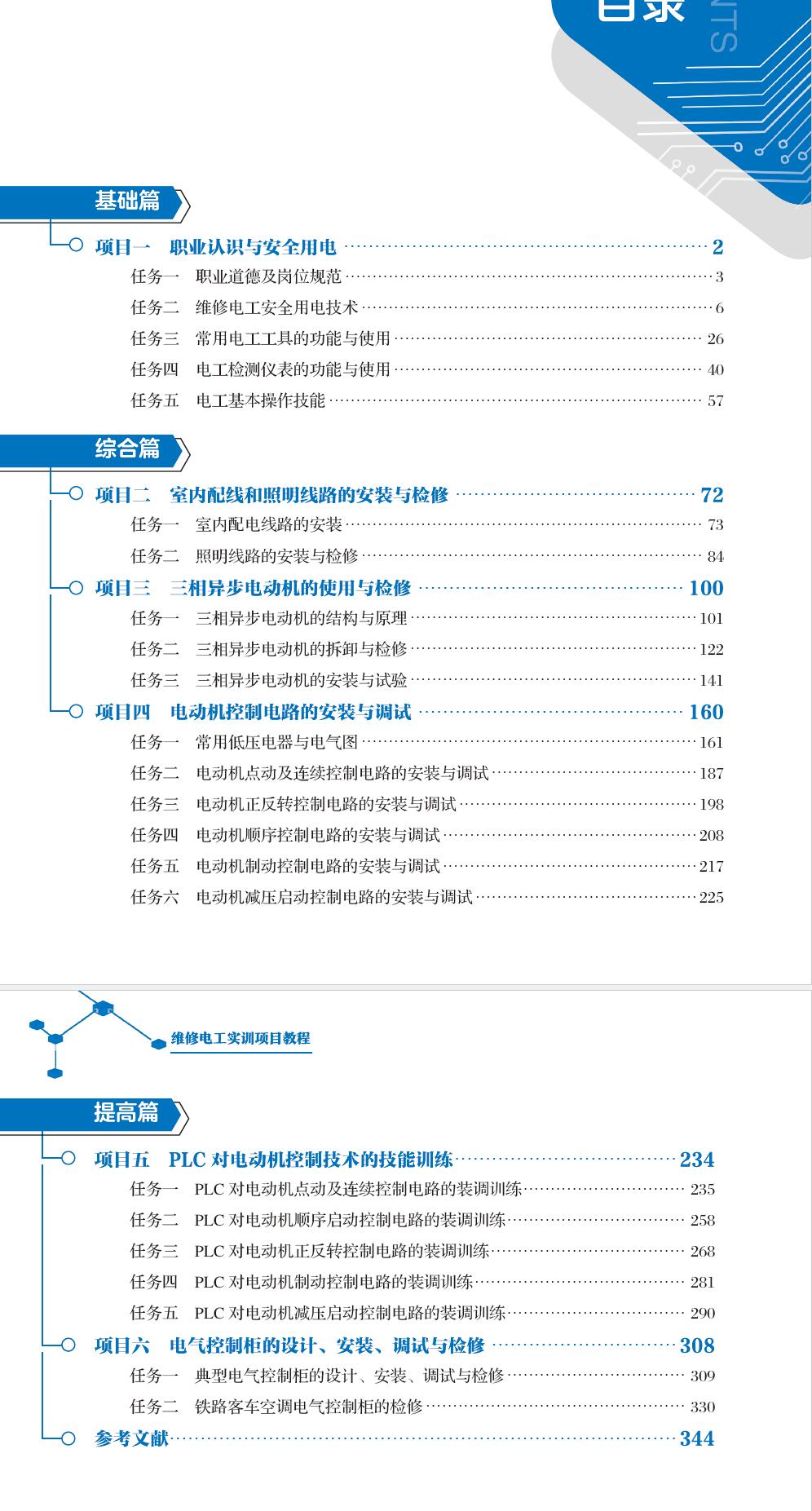 本书采用项目引领、任务驱动的教学模式,共设六个项目,分别是职业认识、安全用电及电工基本操作技能;室内配线和照明线路的安装与检修;三相异步电动机的运行与拆装;电动机控制线路的安装与调试;PLC 对电动机控制技术的技能训练;电气控制柜的设计、安装、调试与检修,项目中设有任务,任务设计从简单到复杂,从单一到综合,符合学生的认知规律和技能形成规律,全面涵盖了维修电工的基本知识和技能训练内容。
