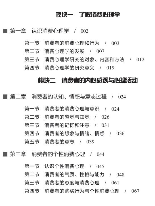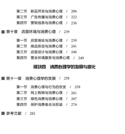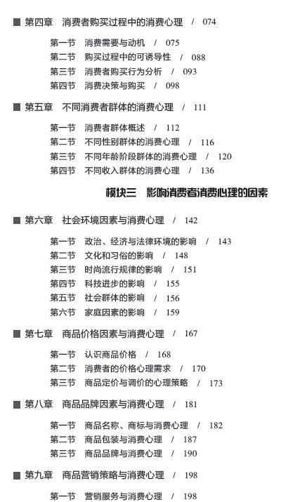 本书共分为四个模块,十一章内容。其中,模块一主要介绍消费心理