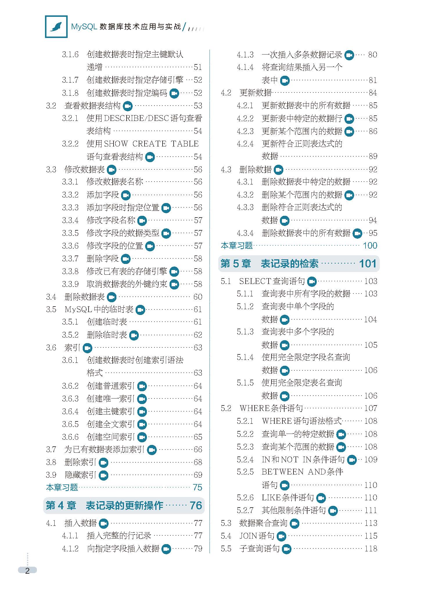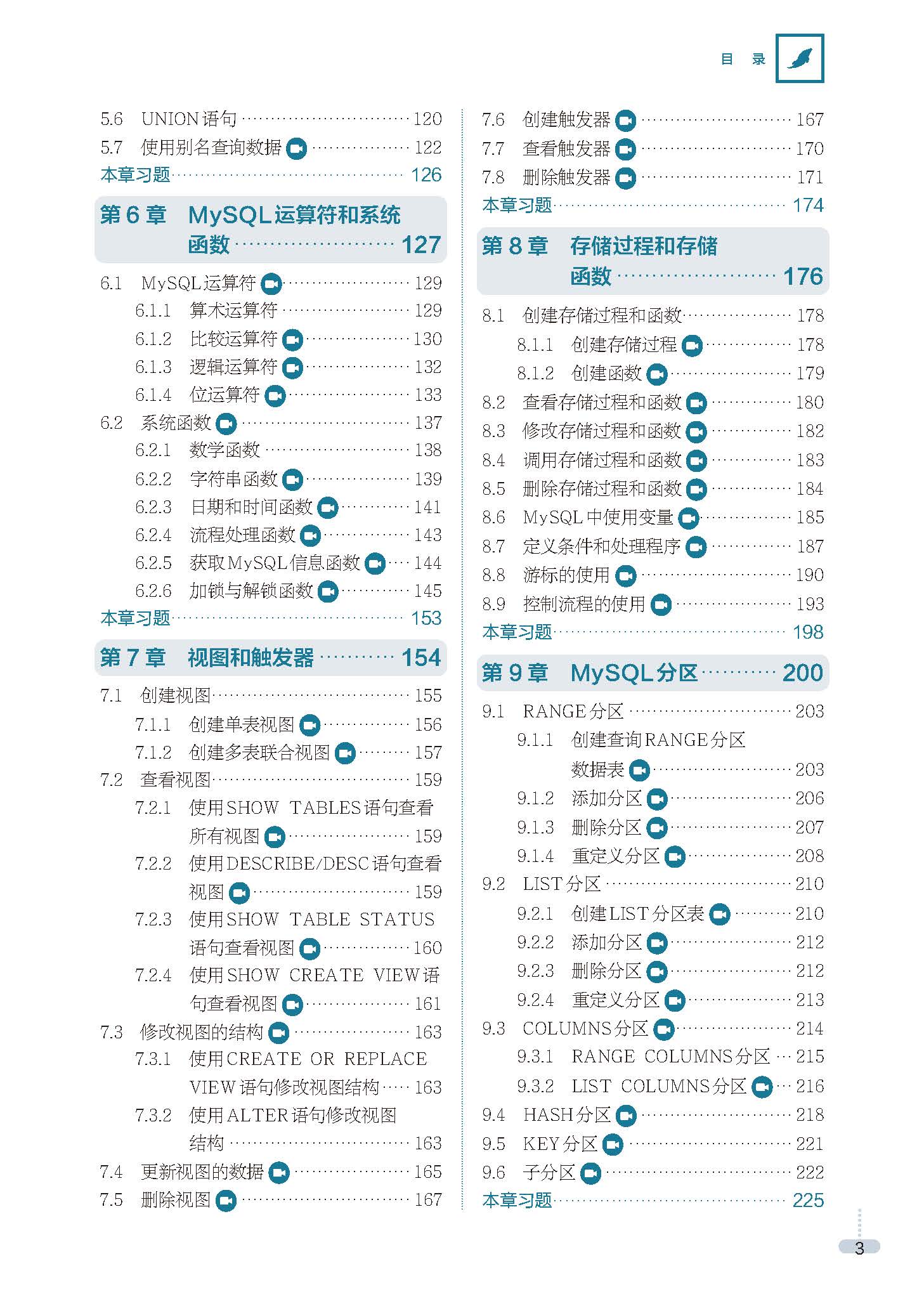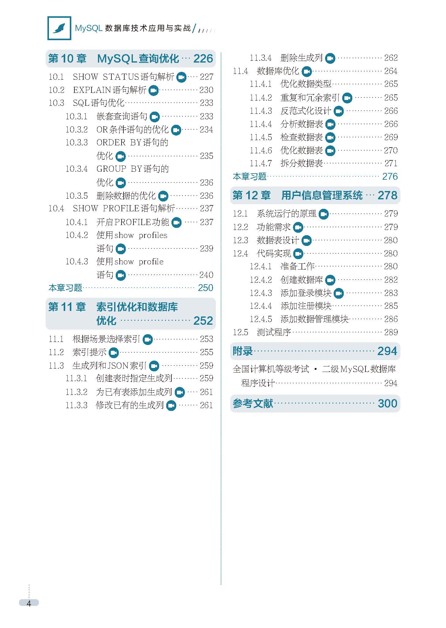 本书共12章,包括数据库设计概述、MySQL环境配置和创建数据库、MySQL表结构的管理、表记录的更新操作、表记录的检索、MySQL运算符和系统函数、视图和触发器、存储过程和存储函数、MySQL分区、MySQL查询优化、MySQL索引优化和数据库优化以及用户信息管理系统。